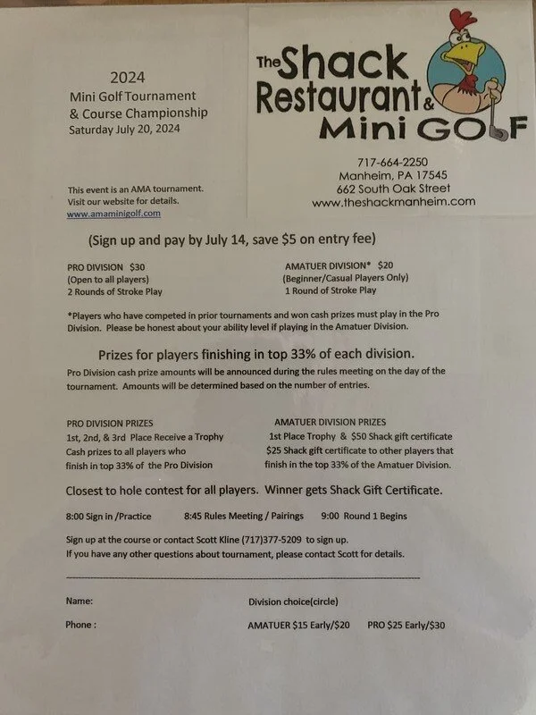 Registration: For Saturday’s event, you can pay via Eventbrite at https://2024-rogue-eagle-mini-golf-tournament.eventbrite.com. An alternative option for paying for tickets without fees is to pay to AMA organizer Tom Loftus via Venmo. If you pay this way, please email amaminigolf@gmail.com your name , who you are registering, divisions for the people being registered, and general contact information.